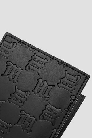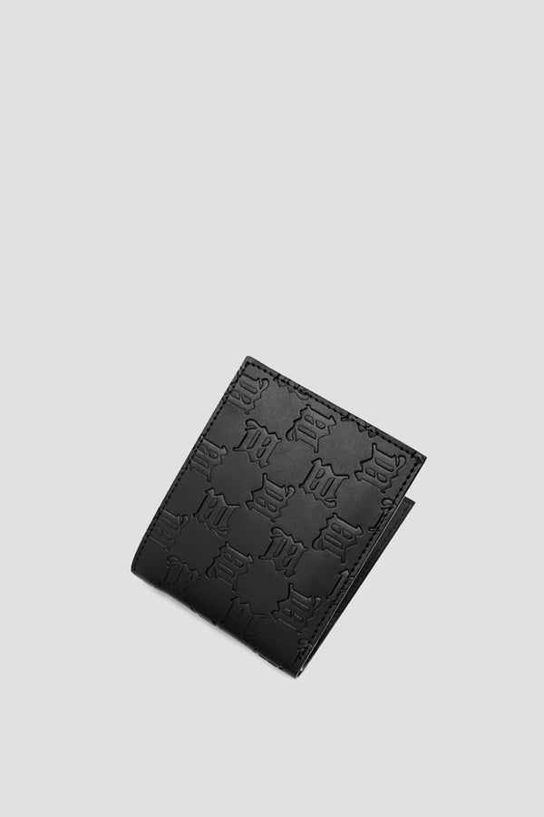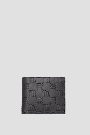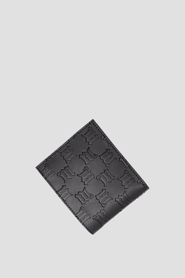 Classic black leather bifold wallet crafted in a genuine leather and embossed with "M" monogram pattern. 6 card slot and 1 compartment for banknotes. Tonal stitches. Logo lining.