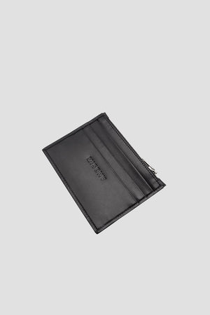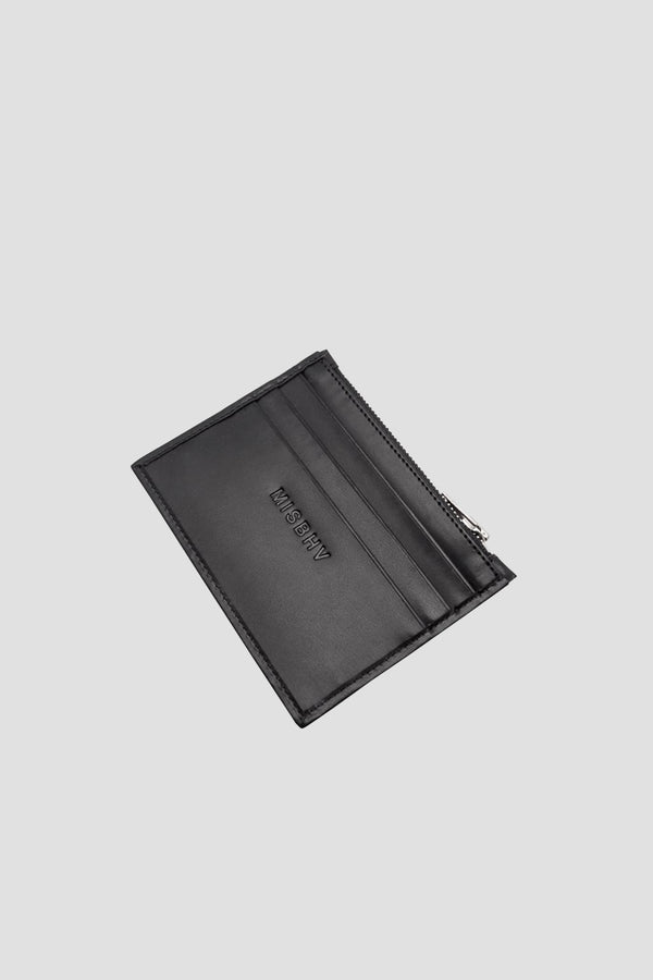Classic black leather cardholder crafted in a genuine soft leather and embossed with "M" monogram pattern. 3 card slots. Separate zip pocket. Small zipped coin pocket.
