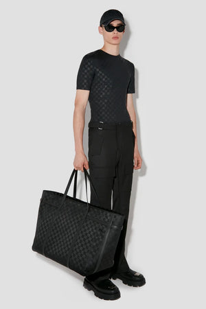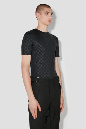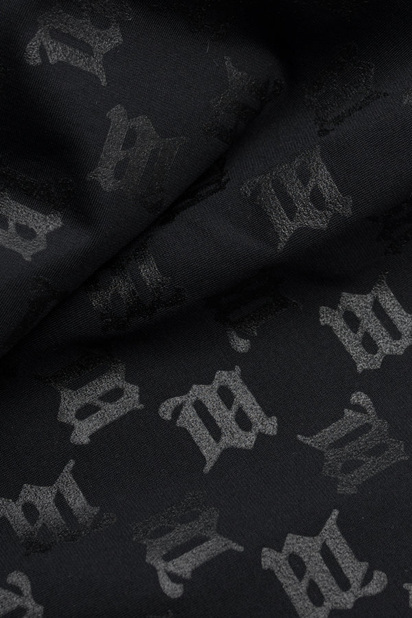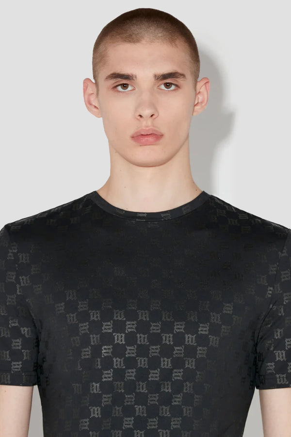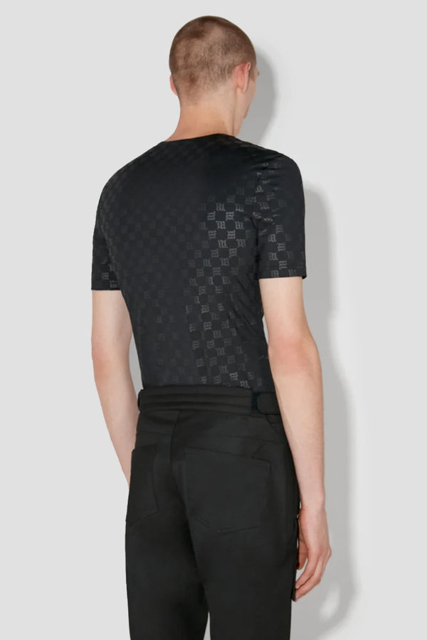 Black fitted t-shirt made from stretchy fabric. Allover "M" monogram pattern.