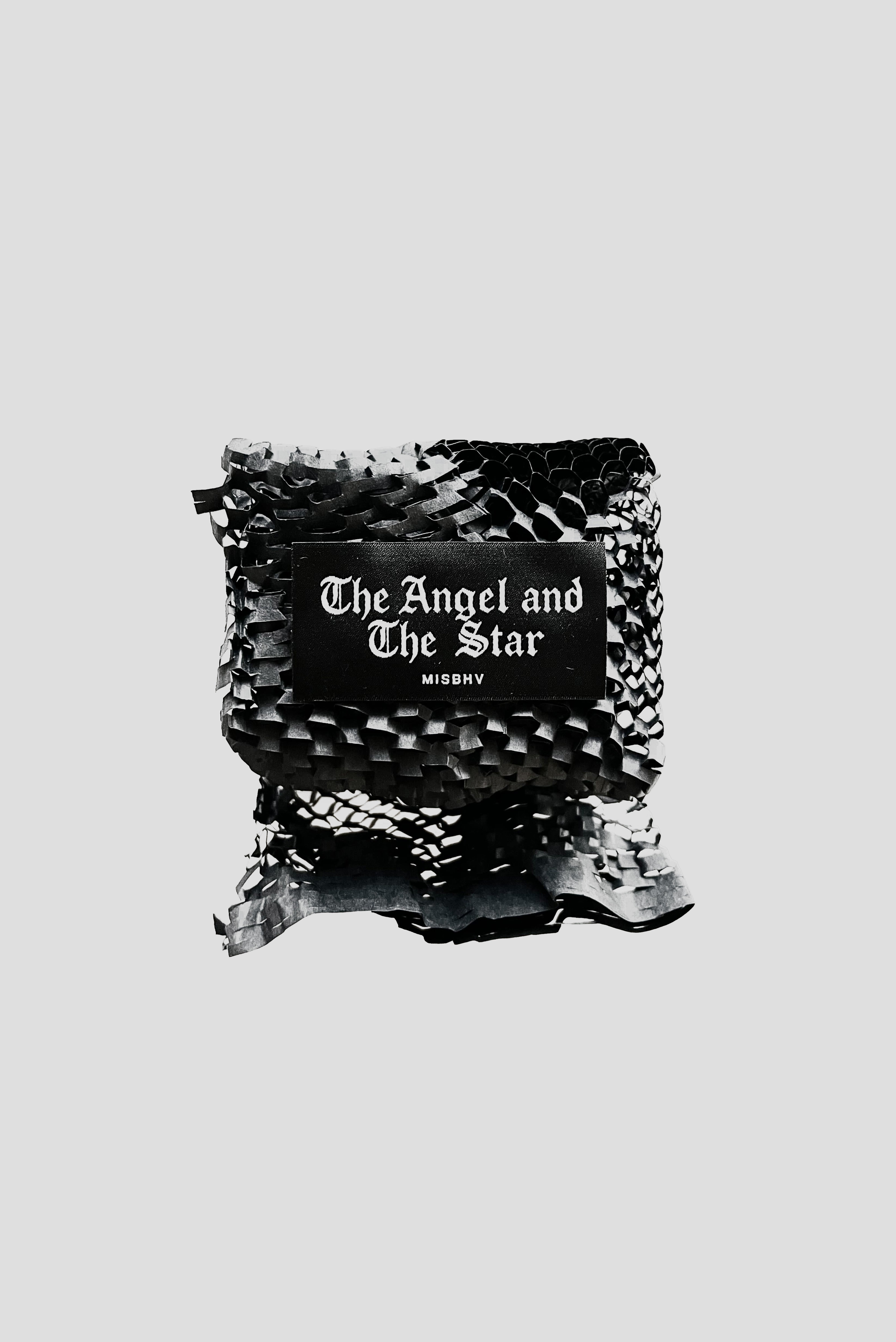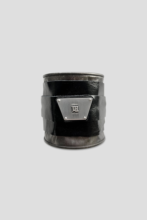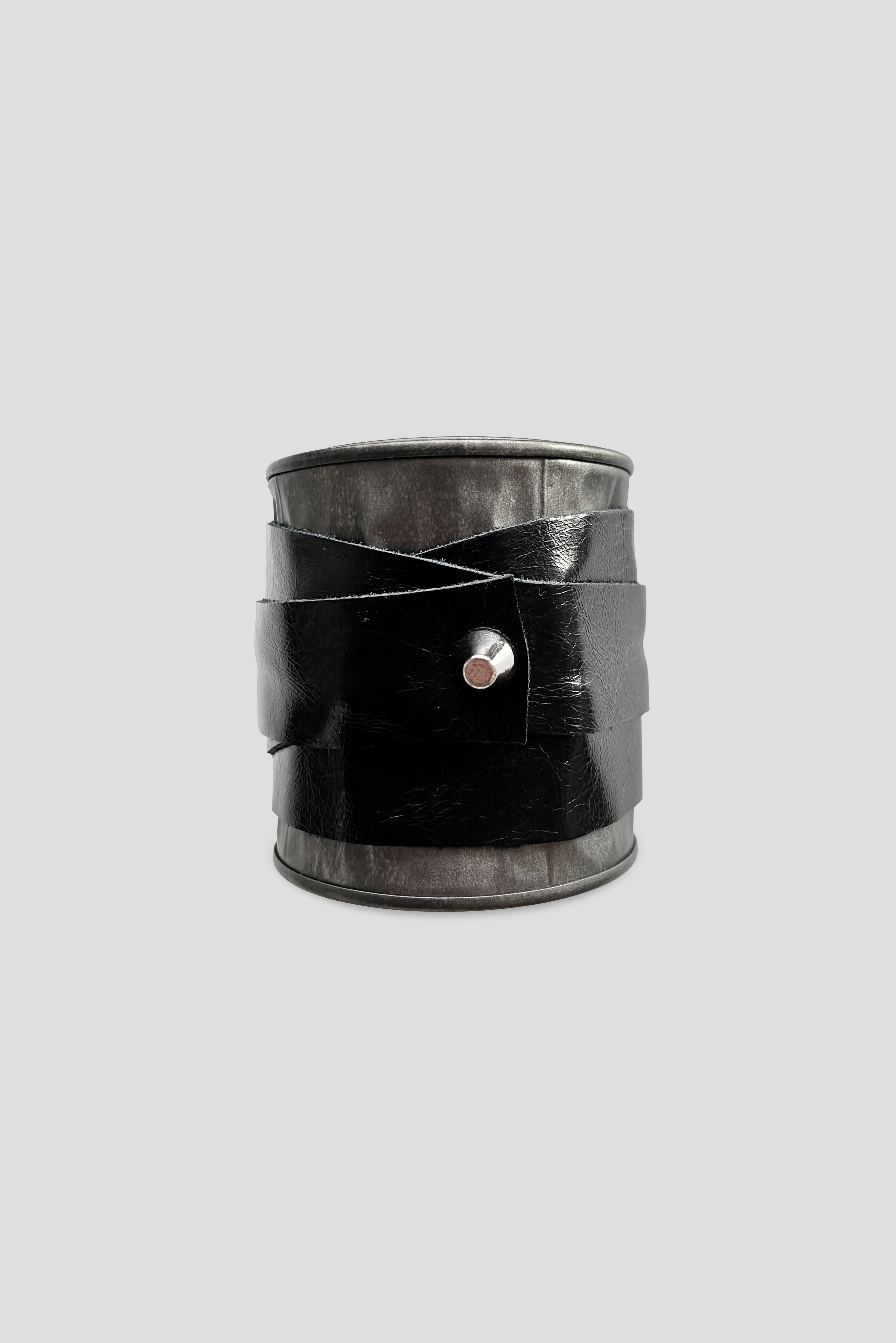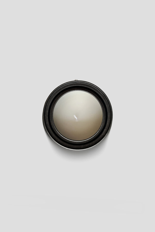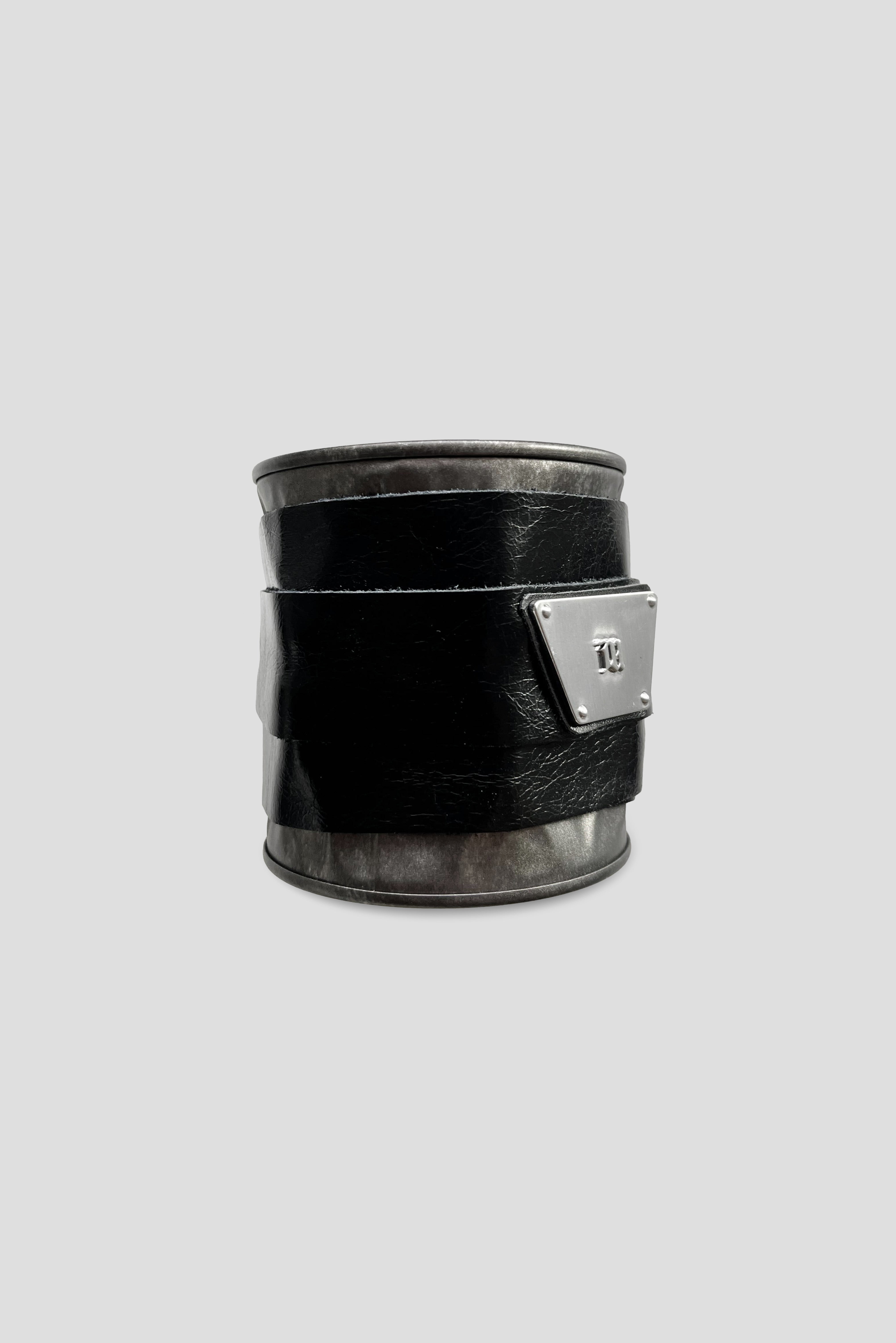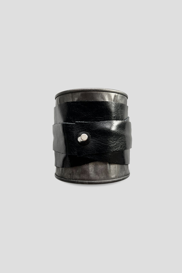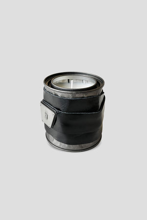 Fragrance candle encased in a solid, deformed metal casing. Wrapped with a genuine leather strap featuring a logo on the front.