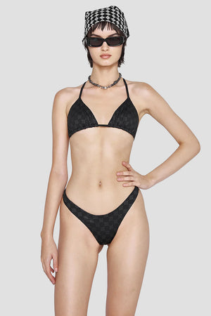Black brazilian cut bikini bottom with black monogram print all-over. Mid-rise. Elastic fabric. Tonal stitching. Fully lined.