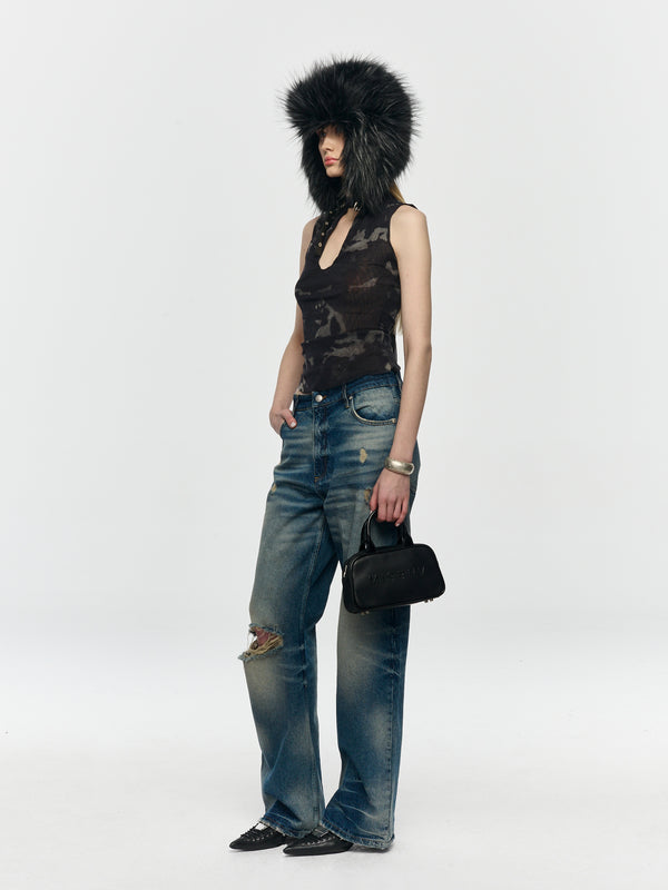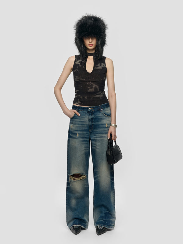 Mesh tank top. Camo pattern throughout.