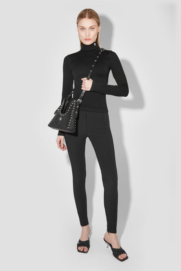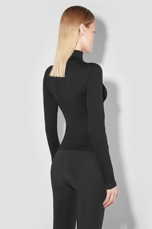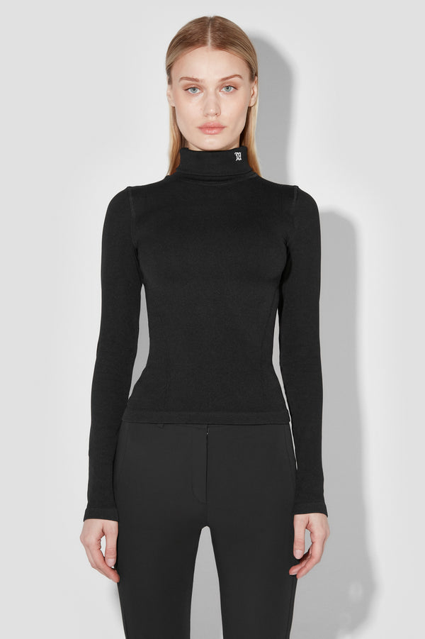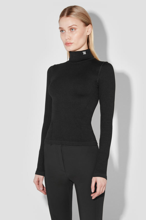 Black turtleneck in a stretchy and tight rib quality. White "M" monogram embroidery at the neck.