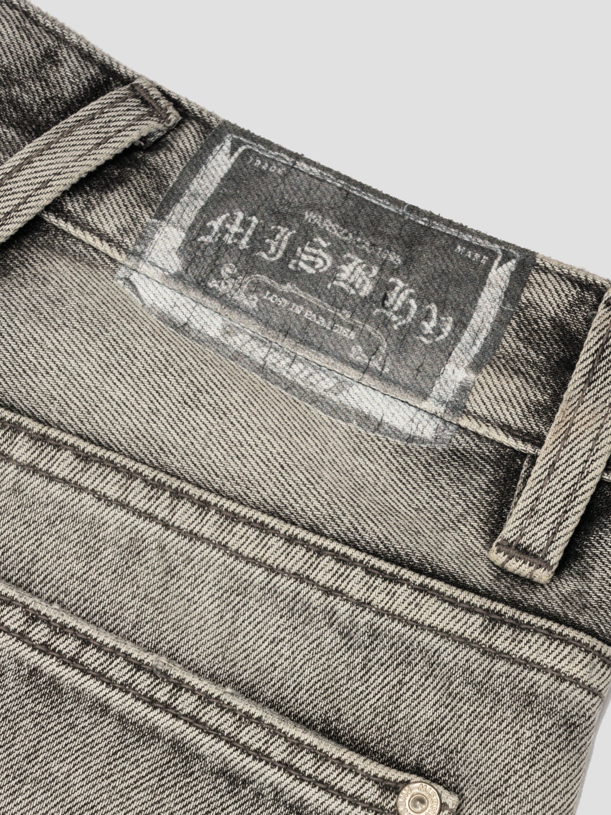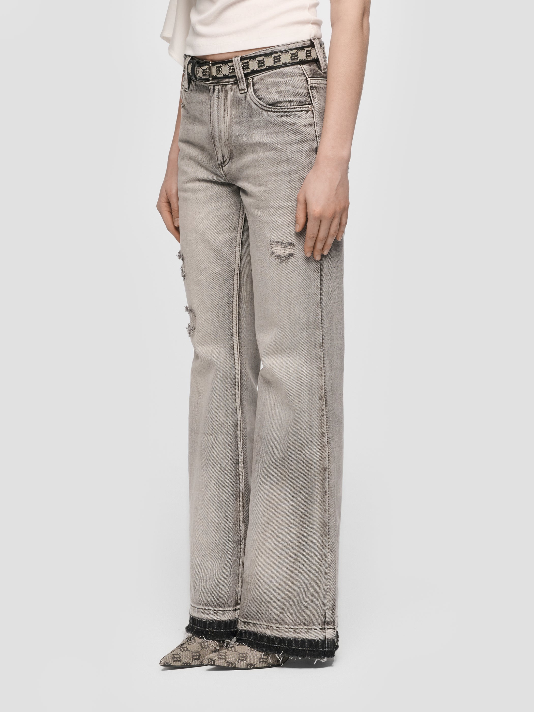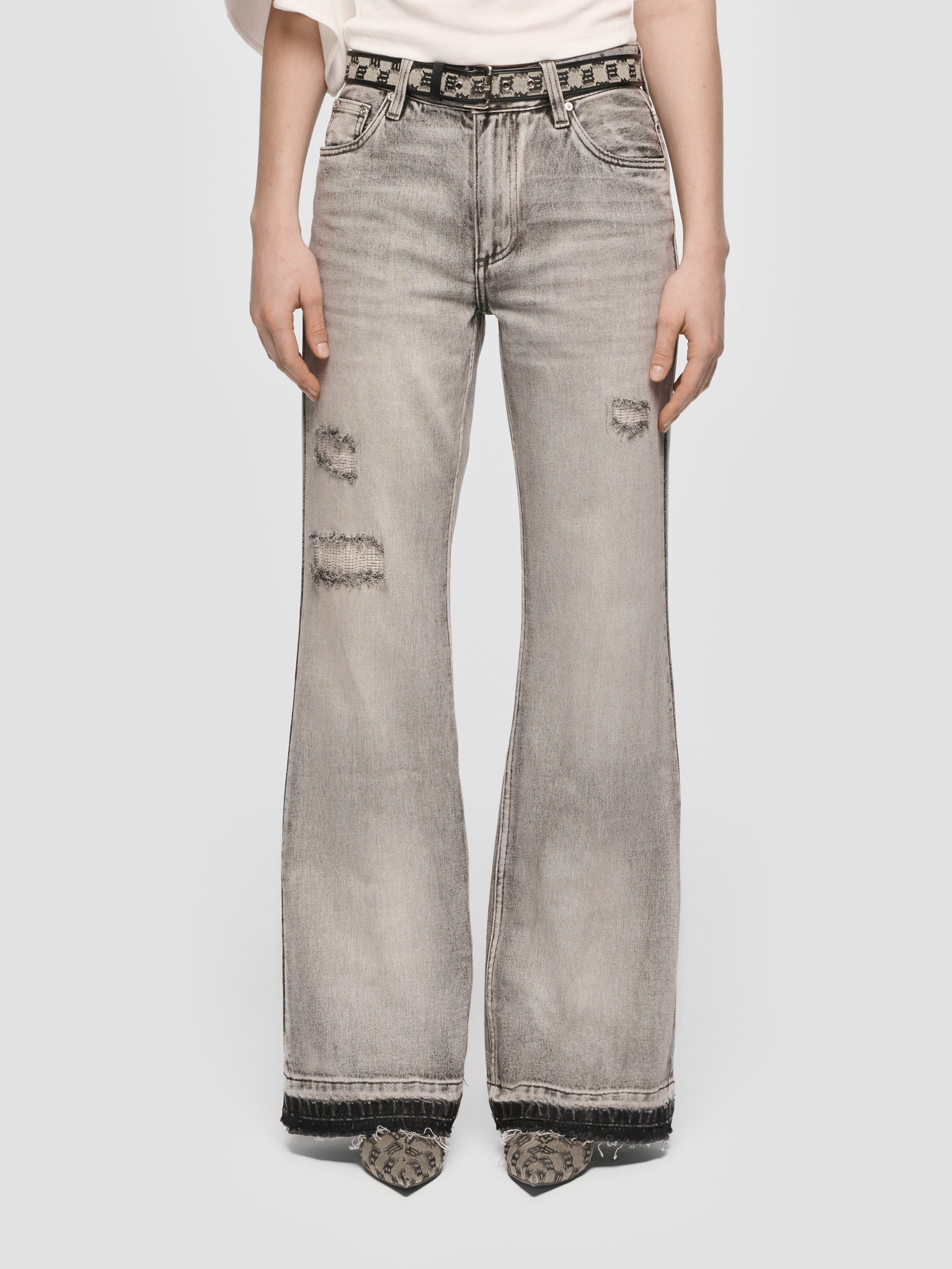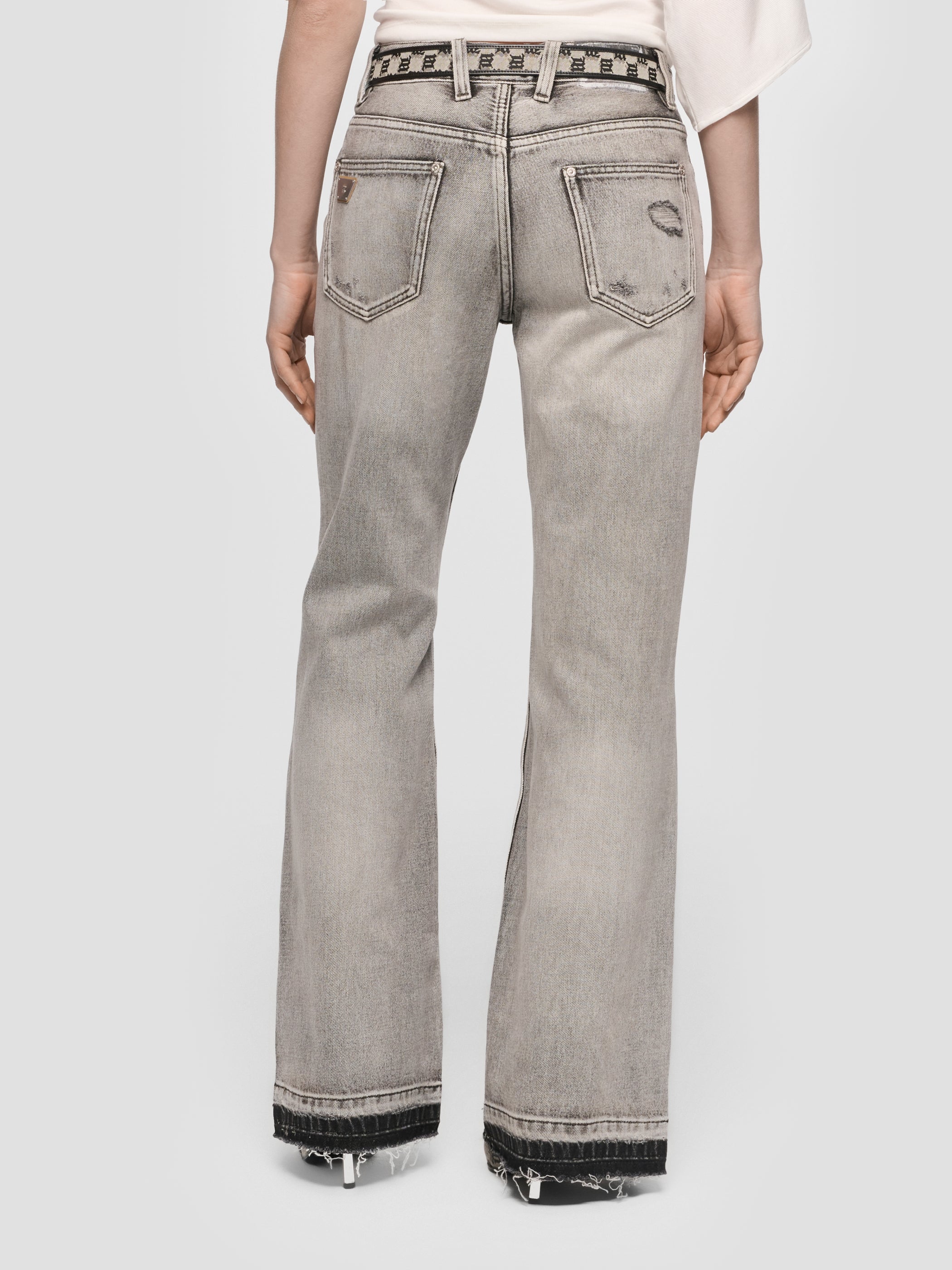 Flared denim trousers in grey. Seasonal wash throughout.