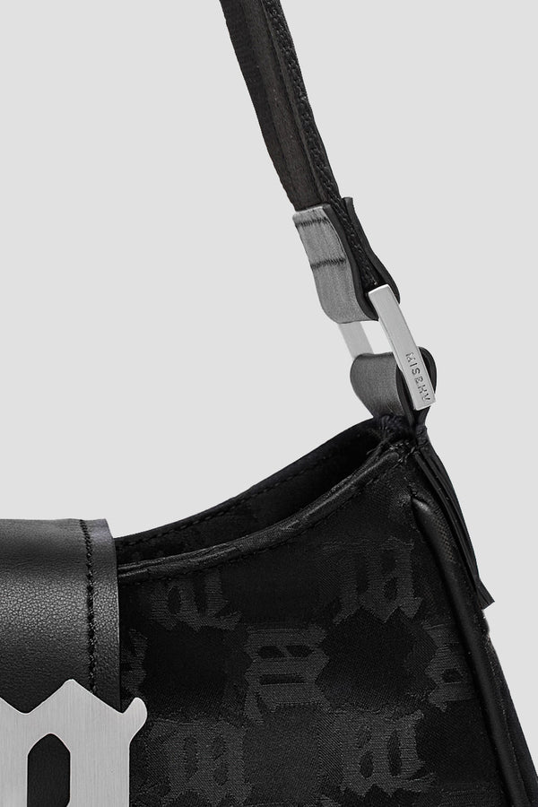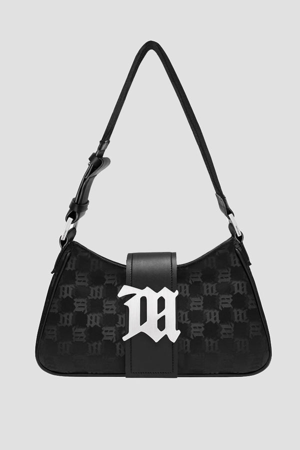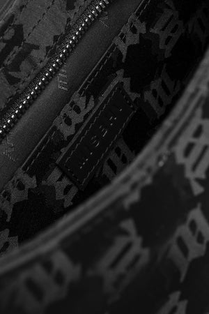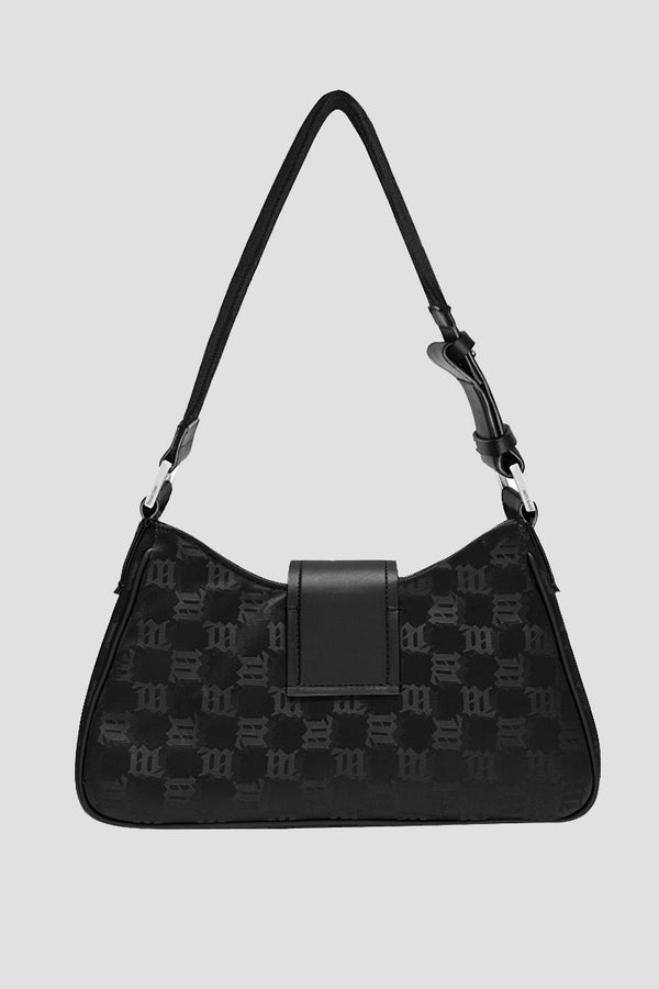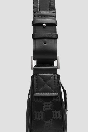 Shoulder bag crafted from monogram patterned fabric with genuine leather finishing in black. It features a branded black lining. It is closed with a zipper and buckled with a big monogram. Every metal detail has a brushed finish. The bag strap is partly made of a mix of organic cotton (7%) and recycled polyester (93%).