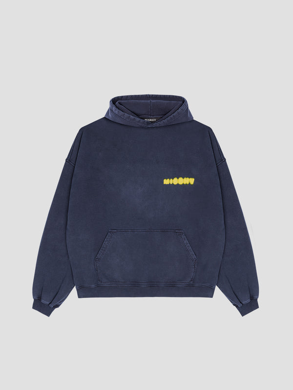 Heavyweight french terry hoodie in navy. Fading throughout.