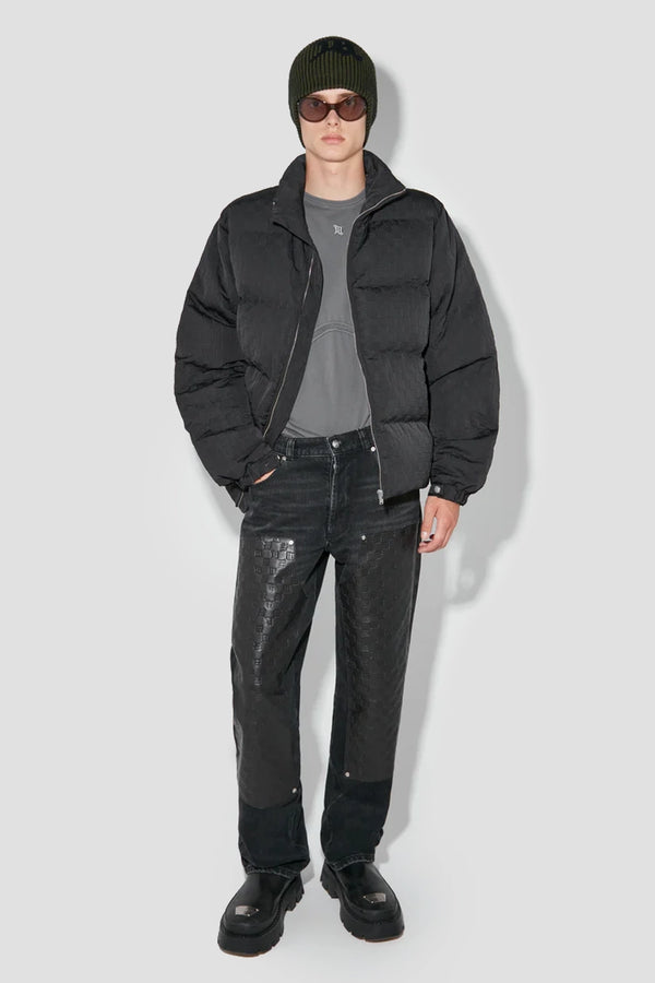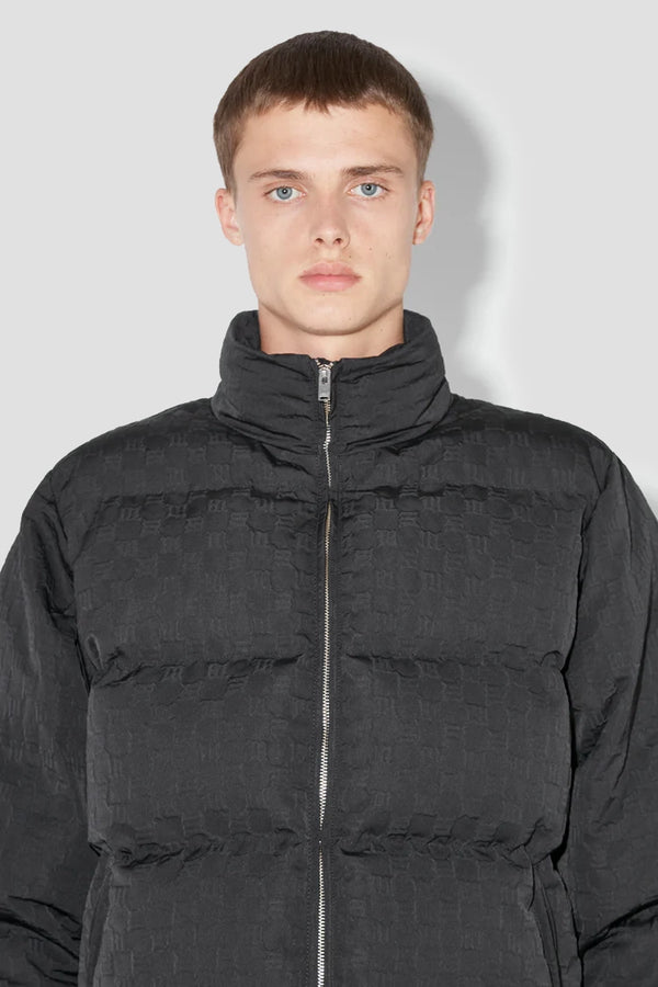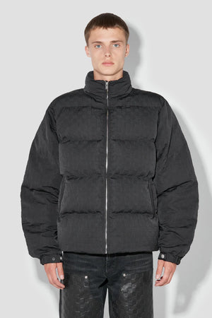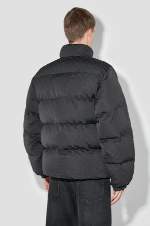 Black nylon puffer jacket with PRIMALOFT filling. Embossed monogram pattern throughout.