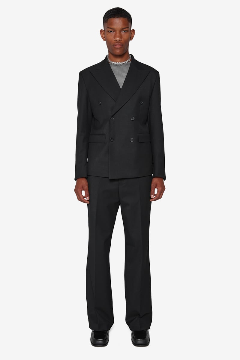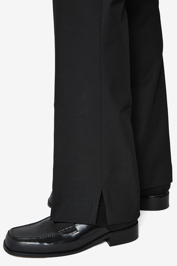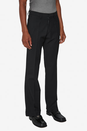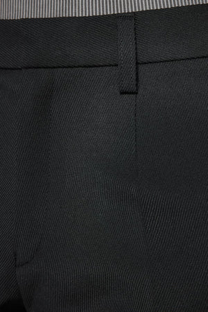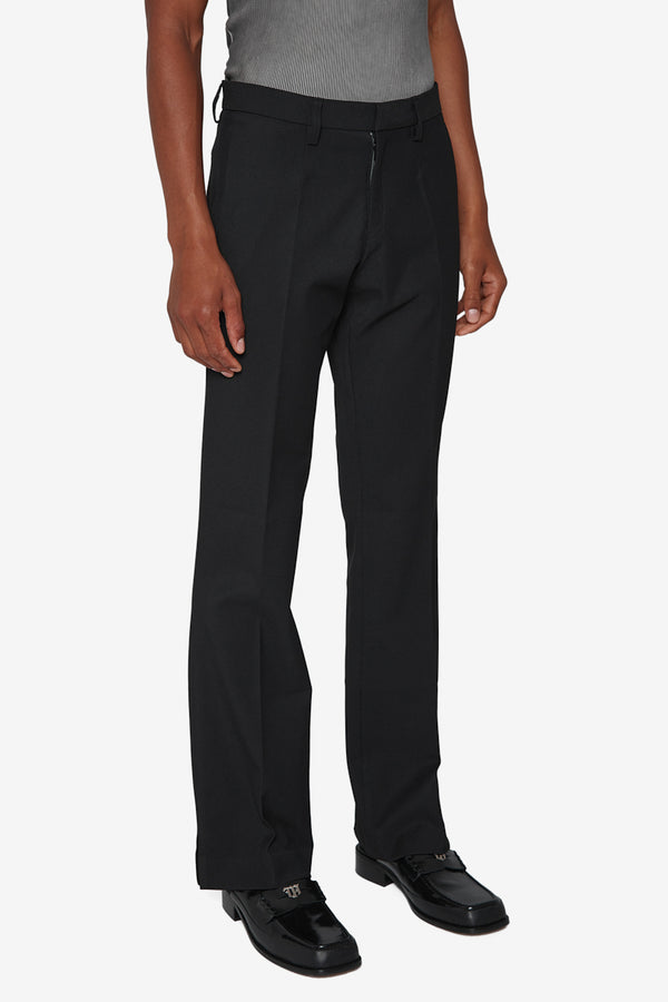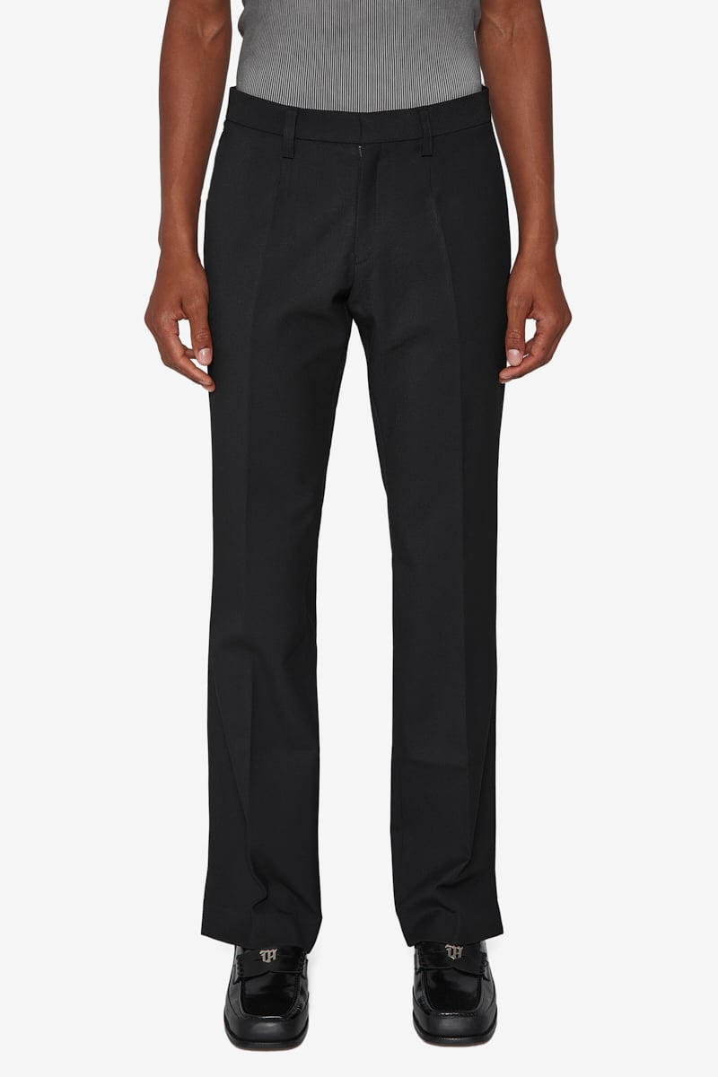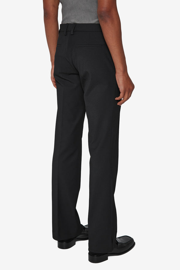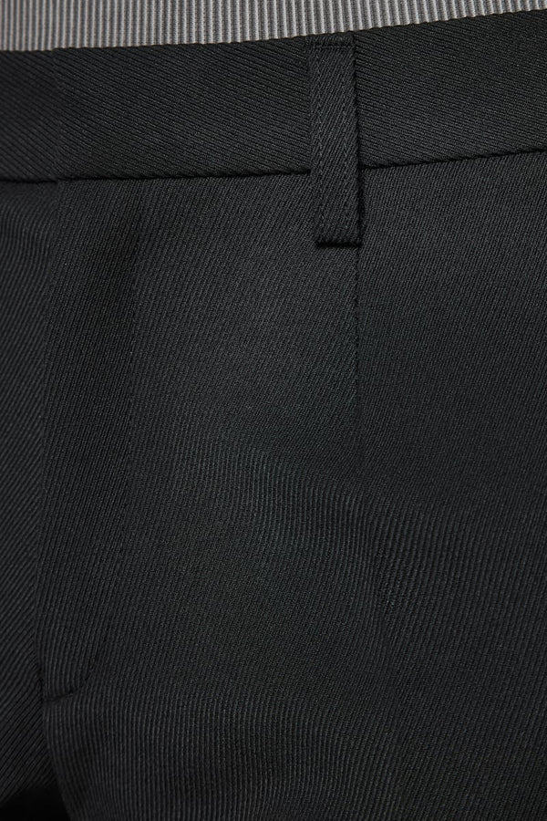 Slim fit trousers in black. Mid-rise. Creased legs. Belt loops at waistband. Zip-fly.